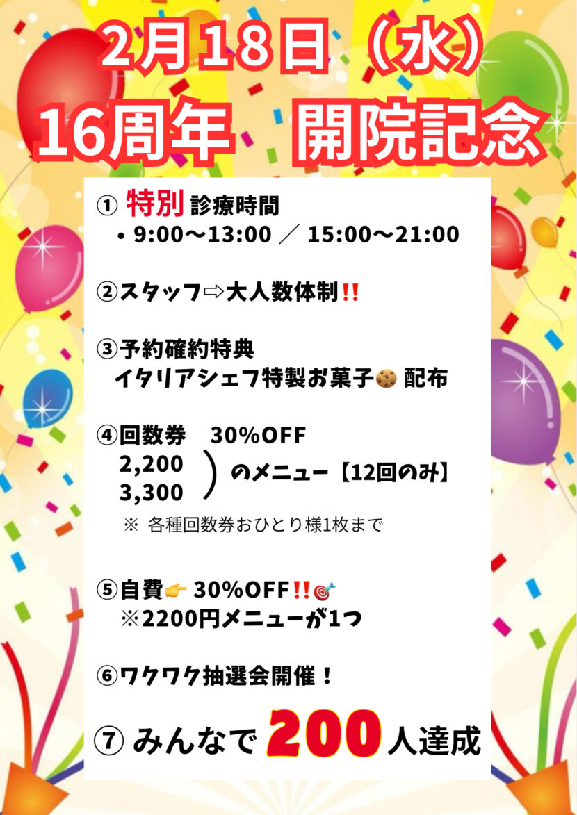 【16周年イベント開催のお知らせ】 日頃よりご来院いただいている皆さまのおかげで、当院は16周年を迎えることが… この記事の続きを読む