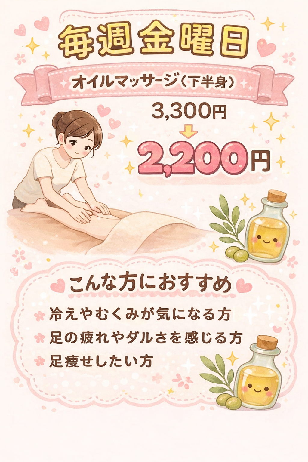 通常 3,300円のオイルマッサージが、金曜日限定で 2,200円!