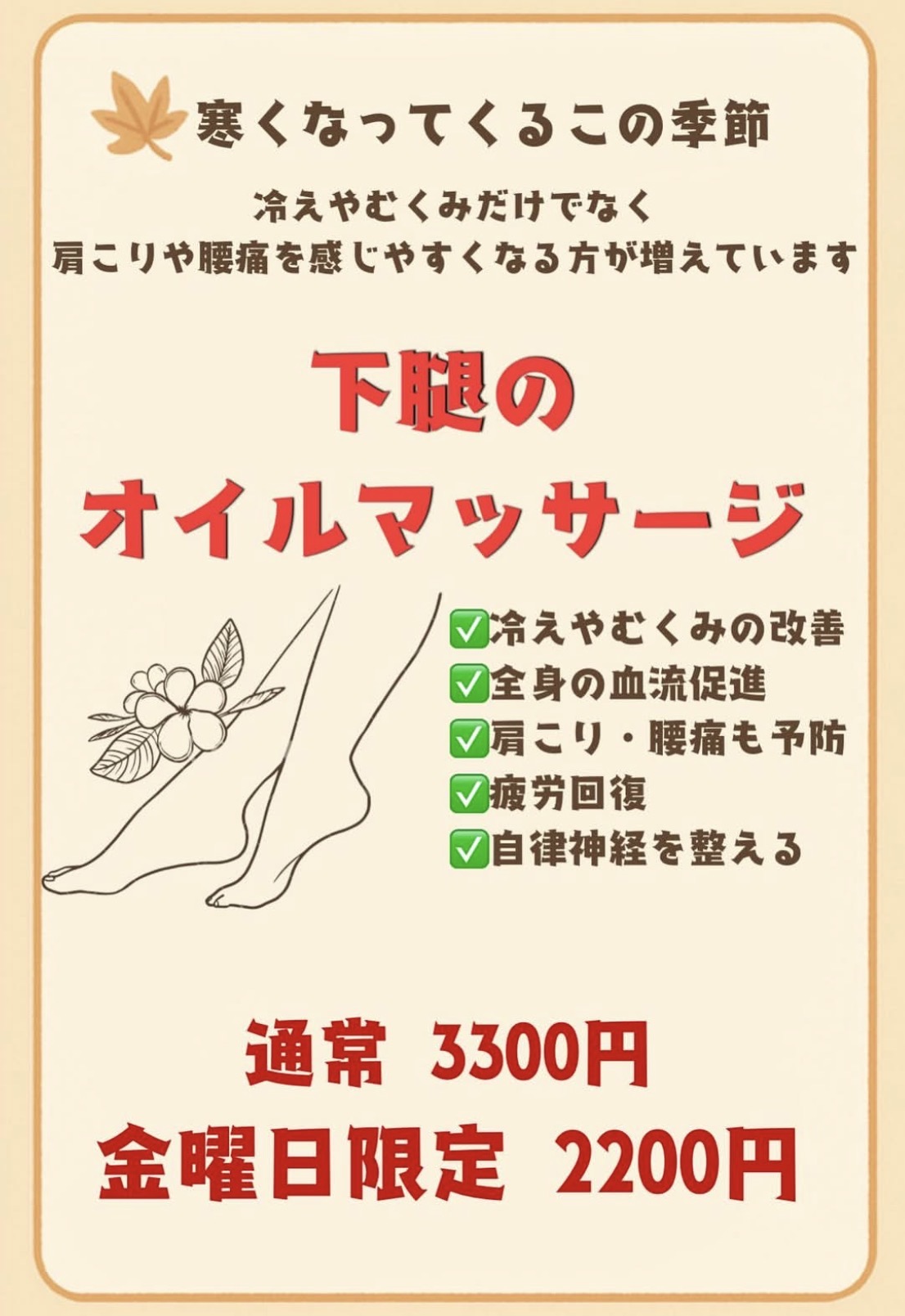 寒さで不調が出やすいこの時期こそ、足から整えるオイルマッサージでしっかりケアしてみませんか?✨